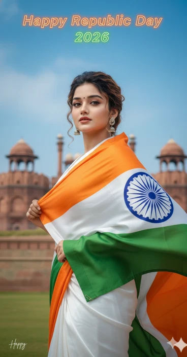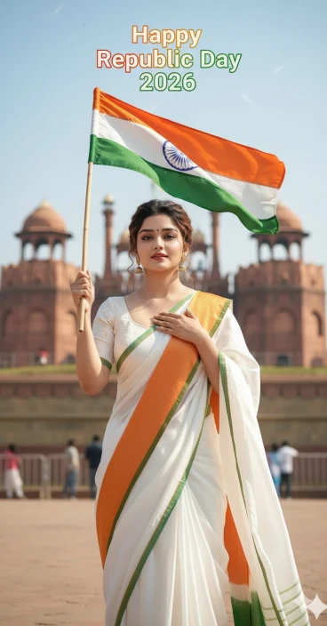 Keep my face exactly the same as the uploaded reference image. Do not change, smooth, beautify, reshape, or regenerate my face in any way. The facial structure, eyes, nose, lips, skin texture, and expression must remain 100% identical to the reference photo. This is a strict face-lock requirement. Create an ultra-realistic cinematic Republic Day 2026 portrait of a young Indian woman standing proudly at Red Fort (Lal Qila), Delhi. SUBJECT & POSE • The woman stands in the center of the frame • Her body is facing forward • Her right hand is holding the Indian tricolor flag firmly • Her left hand is placed gently on her heart in a respectful patriotic gesture • Shoulders straight, posture elegant and confident • Head slightly raised • Eyes filled with emotion, pride, and respect • Expression: calm, powerful, patriotic, slightly emotional FACE & IDENTITY (VERY STRICT) • Use the uploaded face as the only reference • Face must be 100% identical • No face morphing • No beauty filters • No skin smoothing • Natural pores, fine lines, and texture must remain • Skin tone must remain natural • Eyes, lips, nose, jaw, and expression must stay exactly the same • HD face clarity — sharp, clean, natural human look OUTFIT (TRICOLOR ELEGANCE) • Flowing white saree or kurta • Saffron dupatta moving in the wind • Green blouse or border accents • Outfit looks graceful, festive, and patriotic • Fabric texture clearly visible FLAG DETAILS • Large Indian national flag 🇮🇳 • Placed slightly above and behind her • Fabric flowing strongly in the wind • Ashoka Chakra visible • Realistic folds and cloth physics BACKGROUND • Red Fort (Lal Qila) clearly visible • Open Delhi sky • Light festive decorations • Subtle crowd blur in far background TEXT IN BACKGROUND • Glowing tricolor styled text reading “Happy Republic Day 2026” • Soft cinematic glow LIGHTING & MOOD • Bright cinematic daylight • Soft sunlight on face • Balanced shadows • Warm patriotic colors • Emotional and proud atmosphere CAMERA & QUALITY • DSLR professional photography look • Medium-full body framing • Shallow depth of field • Ultra-realistic • 4K to 8K clarity ASPECT RATIO.