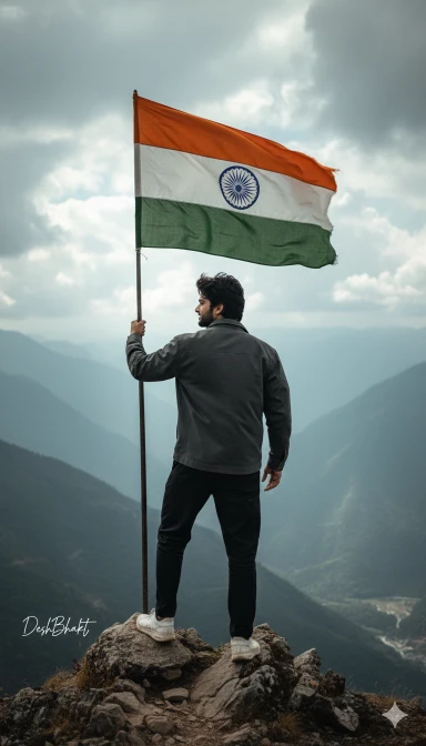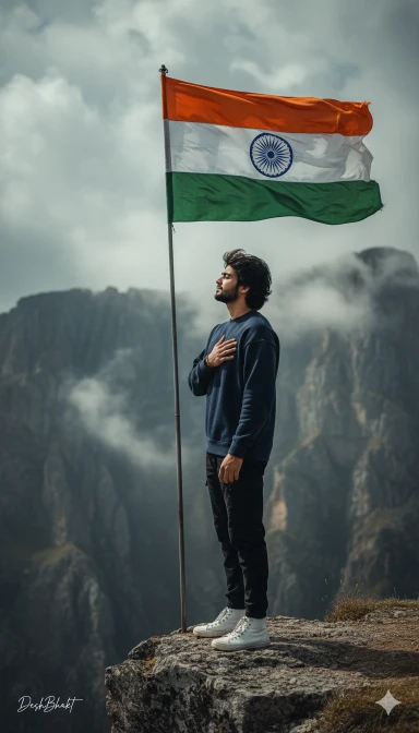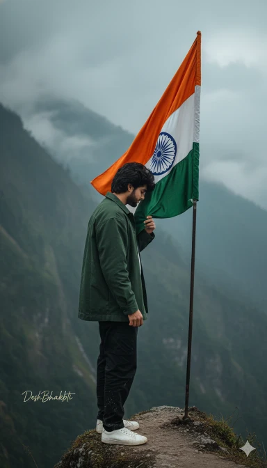Keep my face exactly the same as the uploaded photo. Do not change, edit, beautify, smooth, or regenerate my face in any way. 100% exact face accuracy is mandatory. Create an ultra-hyper-realistic cinematic patriotic photograph using the uploaded reference image. FACE & IDENTITY (STRICT LOCK) • Face must remain 100% identical to the reference image • No face reshaping • No beauty filter • No AI facial modification • Preserve real skin texture, pores, beard, expression, and identity • HD face clarity — facial details must be extremely sharp SUBJECT • A young Indian man standing on a narrow rocky mountain edge • Full body visible • Body slightly turned toward the Indian flag • Deep emotional and patriotic presence POSE DETAILS (COMPLETELY NEW) • Standing upright with feet firmly on rugged rock • One hand gently holding the Indian flag fabric • Head slightly bowed forward • Forehead or lips softly touching the flag (respectful emotional moment) • Other hand relaxed near the side_toggle Emotional tone: devotion, respect, love for the nation FLAG DETAILS • Large Indian tricolor flag 🇮🇳 attached to a pole • Flag waving naturally in mountain wind • Fabric folds visible with realistic motion • Ashoka Chakra clearly visible • Flag placed close to the subject for intimacy OUTFIT DETAILS • Dark forest-green oversized jacket • Black loose trekking pants • White sneakers with light dust • No accessories • Minimal, raw, patriotic styling BACKGROUND & ENVIRONMENT • Steep mountain cliffs • Dense fog filling valleys below • Multiple mountain layers fading into mist • Overcast dramatic sky • Cold high-altitude atmosphere • Highly detailed rock textures LIGHTING & CINEMATIC MOOD • Soft natural daylight • Gentle highlights on face and flag • Fog diffusing light for emotional depth • Cinematic contrast • Goosebumps-level patriotic mood CAMERA & COMPOSITION • Full-body cinematic frame • Slight side-angle composition • Medium-low camera angle • DSLR professional photography look • Ultra-sharp subject, atmospheric background STYLE & QUALITY • Hyper-realistic photography • 8K ultra-detailed resolution • Film-like cinematic tones • Natural color grading • Looks like a real patriotic mountain shoot ASPECT RATIO • 3:4 vertical TEXT / SIGNATURE Add at the bottom-left corner, HANDWRITTEN SIGNATURE-STYLE typography, thin cursive strokes, small size, subtle premium elegance, white or soft off-white color. NEGATIVE PROMPT • AI face • Face change • Smooth skin • Plastic look • Cartoon • Anime • Illustration • CGI • Blur • Low quality • Watermark • Logo • Extra limbs