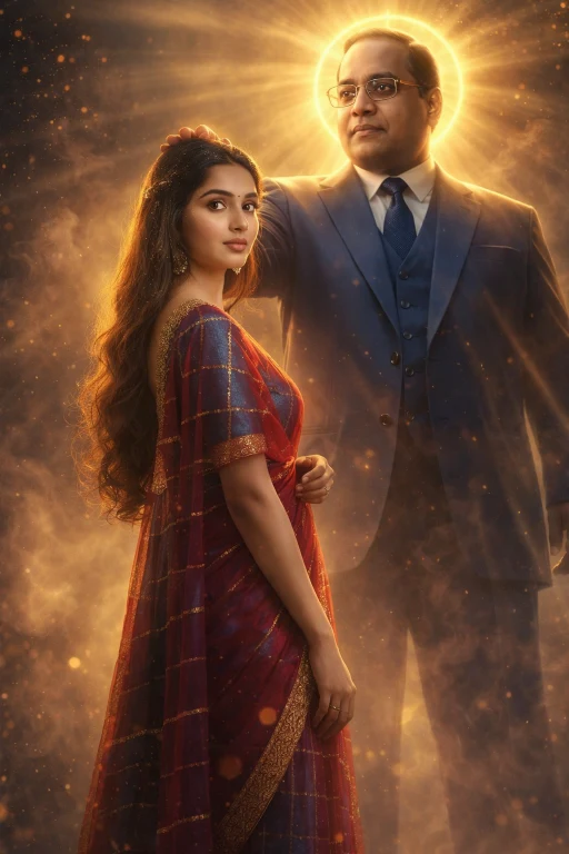 Ultra-realistic cinematic digital artwork of the same girl from the reference image (keep her exact face, expression, hairstyle, and body proportions unchanged), full-body portrait. Behind her stands Dr. B. R. Ambedkar (Babasaheb), positioned slightly taller, gently placing one hand on her head in a blessing gesture.Dr. B. R. Ambedkar is wearing a royal blue coat suit with matching trousers, white shirt, and tie. A glowing golden aura surrounds his body with a radiant halo around his head.Dramatic cinematic lighting, volumetric god rays, golden sparks floating in the air, subtle dust particles, light smoky atmosphere. Warm golden and blue contrast lighting. Low-angle heroic shot to enhance grandeur.Hyper-detailed skin texture, realistic fabric folds, sharp focus, ultra-realistic rendering, 8K ultra HD, high contrast, cinematic composition, depth of field, soft background blur, photorealistic, masterpiece quality.