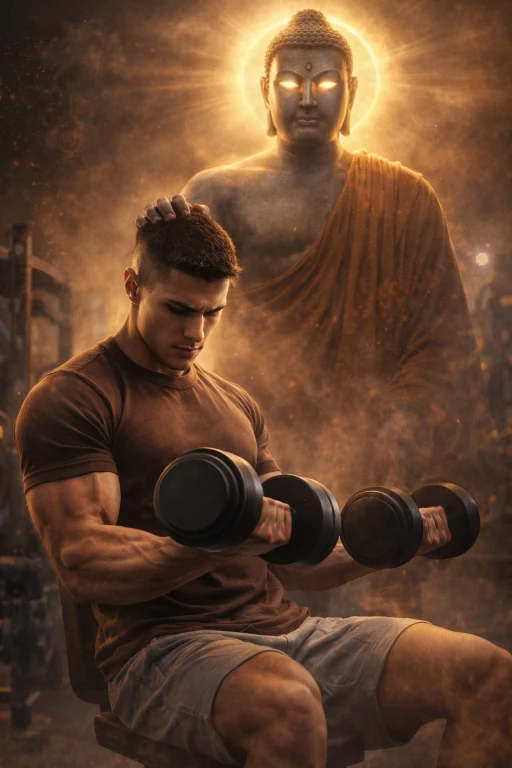 Ultra-realistic cinematic scene of a muscular young man sitting in a gym doing dumbbell curls, focused expression, short fade haircut, wearing a fitted brown t-shirt, surrounded by gym equipment and soft fog. Behind him stands a massive divine Buddha figure as a protective guardian, gently placing one hand on his head in a blessing gesture. The Buddha has glowing eyes, subtle halo, stone-like skin texture, and a saffron robe draped over one shoulder. Dramatic moody lighting with strong contrast, volumetric light rays, smoke particles in the air, warm golden highlights, shallow depth of field, hyper-detailed muscles and skin, cinematic composition, inspirational and powerful atmosphere, 8K, ultra sharp, photorealistic.