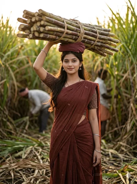 Pose: She stands upright, slightly turned toward the camera, balancing a large bundle of freshly cut sugarcane on her head using a cloth pad. One hand supports the bundle while the other rests naturally at her side.