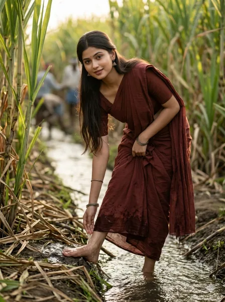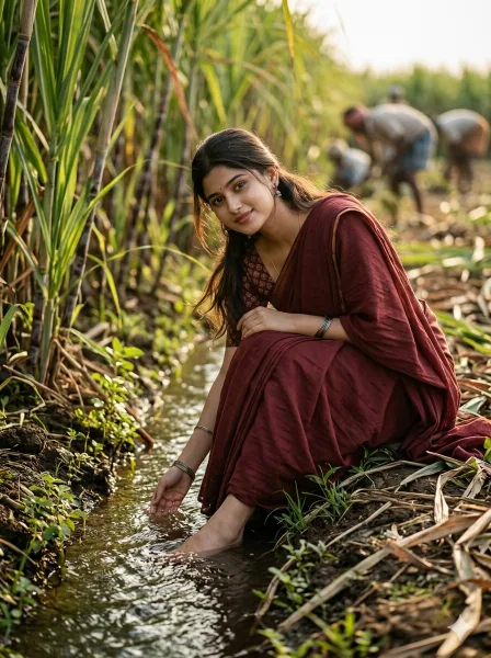 Create an ultra-realistic 8K cinematic vertical portrait (3:4) of a young Indian rural woman in a sugarcane field beside a shallow water channel, capturing a natural action moment with documentary-style realism and soft storytelling. Face must be ultra-HD, razor sharp, crystal-clear with visible pores, natural skin texture, and realistic lighting. Face must be the sharpest element in the image.