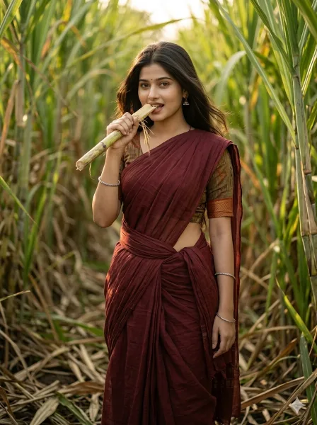 Pose: She is standing with her body slightly turned away from the camera, one hand holding a piece of sugarcane near her mouth as she takes a bite, while the other hand rests naturally by her side.