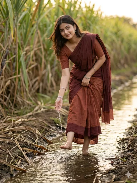 Outfit: Traditional saree in earthy tones like maroon, rust, or brown, with realistic folds and slight water interaction near the edges.