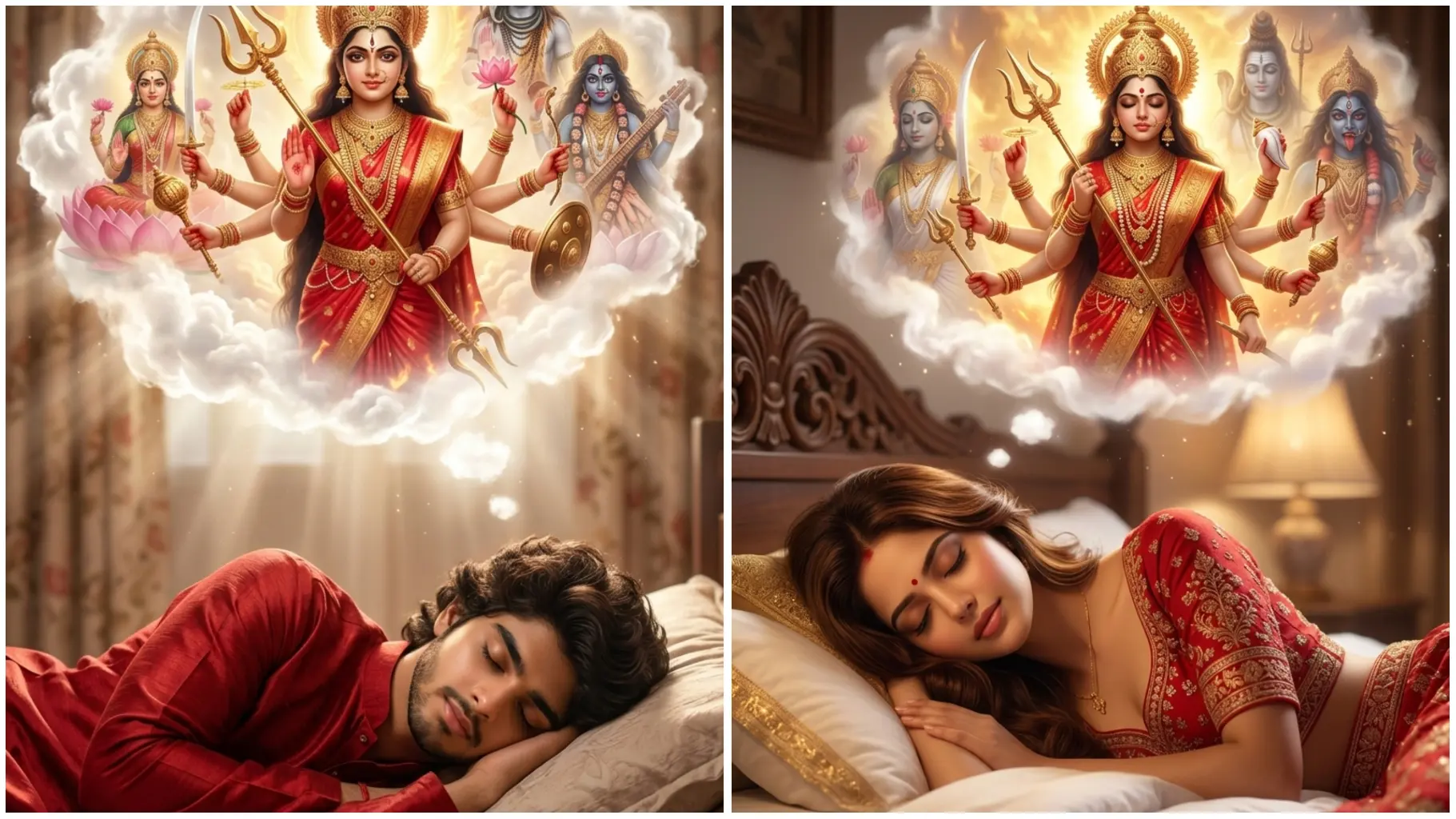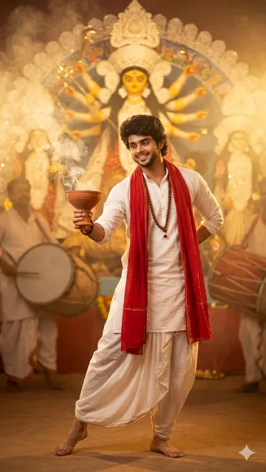 Background: glowing Maa Durga idol, Durga Puja pandal, dhak drummers softly blurred.