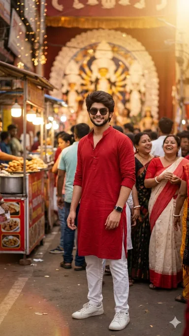 Use the uploaded photo as the face reference and keep the face 100% identical and natural. Create a Bollywood-style candid Durga Puja pandal scene. Outfit: red kurta, white pants, white sneakers, sunglasses and smartwatch, trendy Gen-Z hairstyle. Background: crowded Durga Puja pandal street with lights, food stalls and people laughing, slightly blurred. Lighting: warm cinematic street glow with soft lens flare. Style: ultra-realistic DSLR photo, sharp focus on face, natural colors, depth of field, 4K.