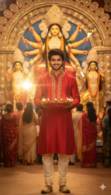 Use the uploaded photo as strict face reference and keep the face 100% identical and natural. Create a Bollywood-style Durga Puja reel poster: red kurta with golden embroidery, churidar pants, mojari shoes, cinematic actor hairstyle, holding an aarti thali with diyas. Background: glowing Maa Durga idol, festive pandal crowd slightly blurred. Lighting: warm golden cinematic light with soft lens flare. Style: ultra-realistic DSLR photo, sharp face focus, natural colors, 4K.