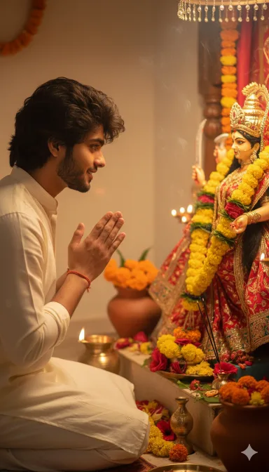 Use the provided face reference exactly without any changes.Keep the same beard, skin tone as in the reference photo.Create a realistic photo of the same person in side-profile, hands folded, receiving blessings from a decorated idol of Durga Mata with flowers and garlands. The surrounding area should have flowers and warm lighting. Do not alter or stylize the face.