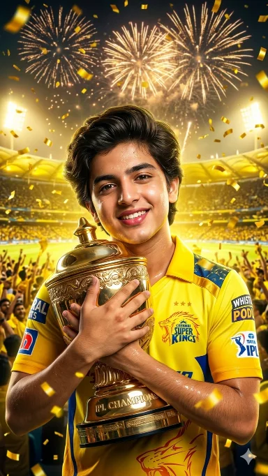 A victorious young Indian male celebrating a championship win inspired by Chennai Super Kings, wearing a bright CSK jersey with golden confetti falling around him, holding a trophy close to his chest, face directly looking into the camera with a proud smile, fireworks exploding in the stadium background, vibrant golden-yellow lighting, crowd blurred but cheering, cinematic celebration moment, ultra-detailed textures, glowing highlights, professional IPL poster design, sharp focus on face, dynamic composition, 8K ultra HD, Take Face From Uploaded image Keep same 100%