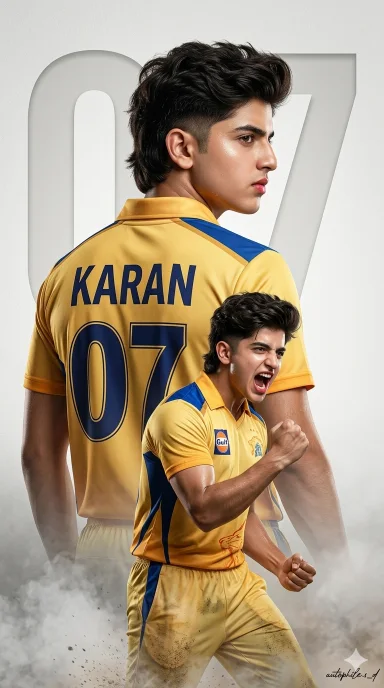“action_input”: “An ultra-realistic cinematic cricket poster featuring the young man from the uploaded image with a fair-whitish glass skin tone, soft red lips, and a voluminous, slightly messy fade mullet hairstyle. He is presented in a powerful dual-pose composition on a clean, textured light-grey studio backdrop with a large, softly embedded ’07’ behind him.\n\nDominant upper pose: The player is seen from the back wearing a golden-yellow Chennai Super Kings (CSK) jersey with blue accents. Bold navy typography reads ‘ANUP’ and the number ’07’ on the back. He has an athletic build and turns his head to show a sharp, intense side profile with a fearless expression.\n\nForeground pose: A dynamic action shot of him celebrating, right fist clenched, arm flexed, in a triumphant shout. He wears the full CSK kit, including match trousers with realistic ground texture. \n\nDetails: Thick dark hair, clean shaved, strong jawline, and realistic skin texture with subtle sweat highlights. Cinematic smoke and dust effects at the base. Premium studio lighting, 85mm lens feel, ultra-sharp focus, photorealistic 8K resolution, vertical poster composition. Small cursive signature ‘autophile.s_d’ in the corner.