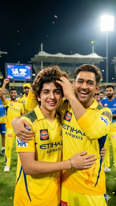 CSK cricketers A reference image man celebrating an IPL match victory. Dhoni, on the right, is laughing joyfully and playfully messing up a reference image man messy voluminous wavy brown hair while hugging him. is smiling brightly. Both are wearing the YELLOW Chennai super king (CSK) jersey with the; ETIHAD airways logo visible and looking towards the camera.
