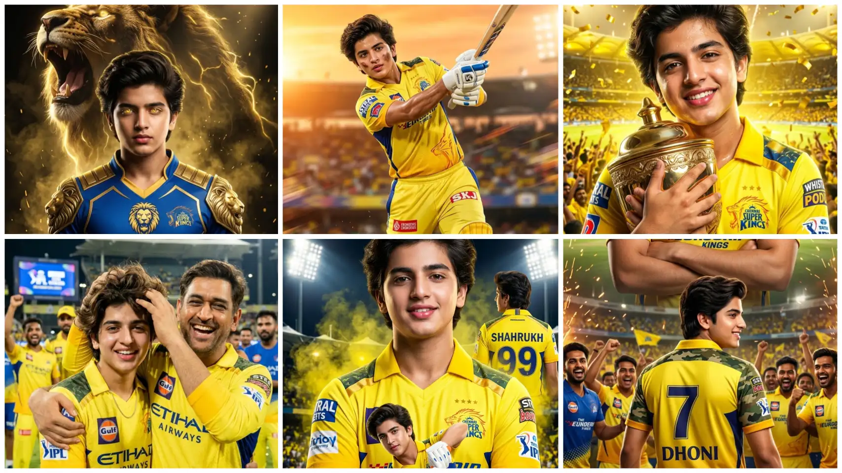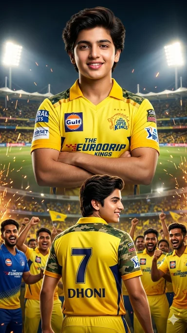 Create a dramatic ultra-realistic IPL-style poster using my photo. Keep my facial features exactly the same. Dress me in a Chennai Super Kings (CSK) inspired yellow jersey with navy blue accents and white sponsor logos on chest and sleeves. Create two versions: a center chest-up portrait with arms crossed and confident smile, and a lower back-body pose wearing a yellow jersey with navy blue “7 DHONI” on the back and army print on both shoulders, smiling and surrounded..