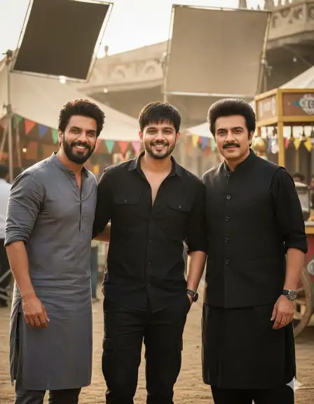 Three close friends at a movie shooting set Real smiles, relaxed body language Zero cartoonish look, pure cinematic realism