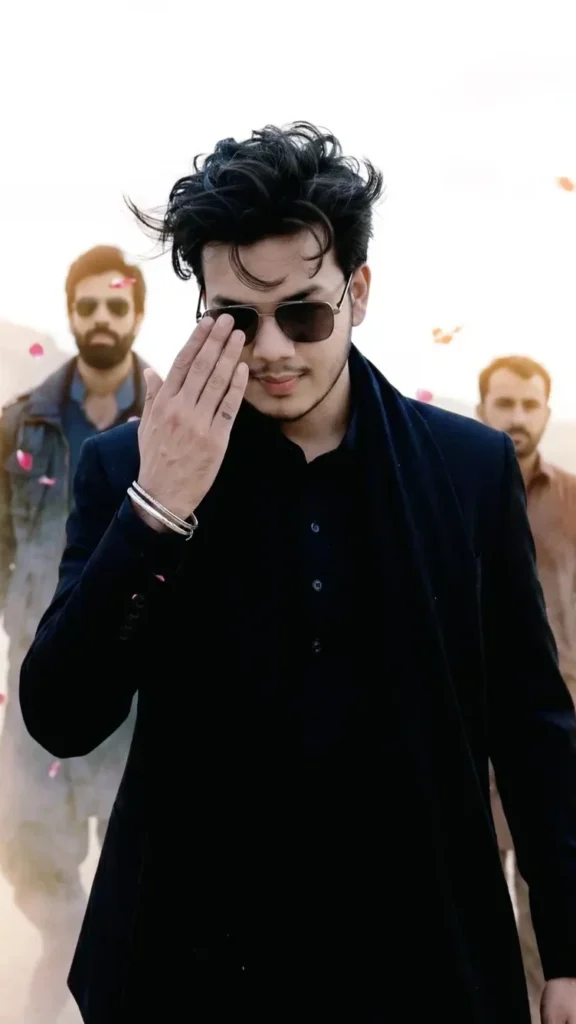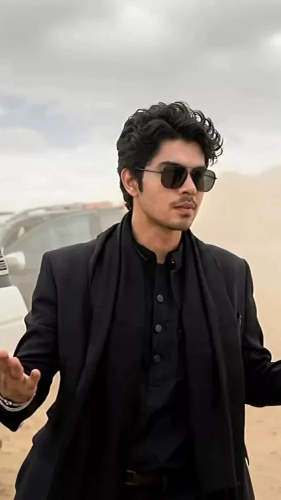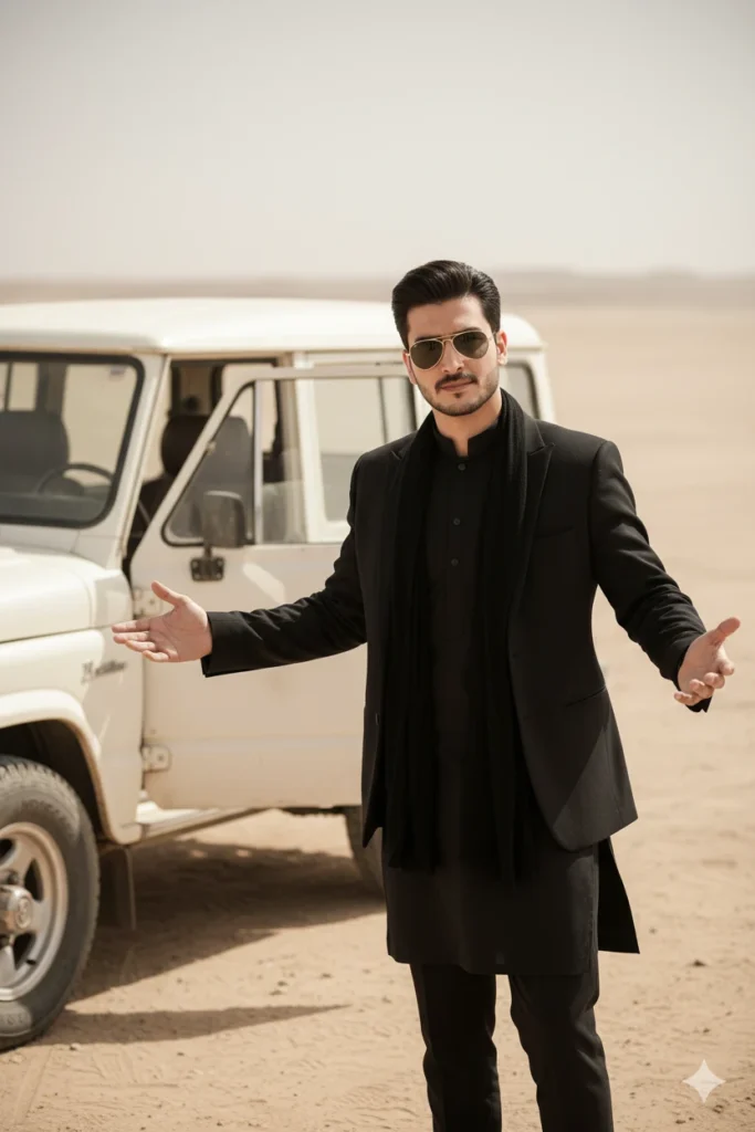 A charismatic, young man with dark,slicked-black hair and gold-rimmed aviator sunglasses. He is wearing a stylish black suit jacket over a black traditional tunic (shalwar kameez). He has a slightly smirking or confident expression and is gesturing outwards with both open palms in a ‘what can you do? pose. He is standing in a dusty, desolate desert or mountainous terrain. luxury SUV is parked behind him. The background is dusty with soft cloudy skies and muted beige tones. Cinematic lighting shallow depth of field realistic photography, 4K ultra-detailed moody Bollywood movie scene dramatic atmosphere professional color grading. Preserve Face 100% I want 100% same face as in the reference image no alteration.