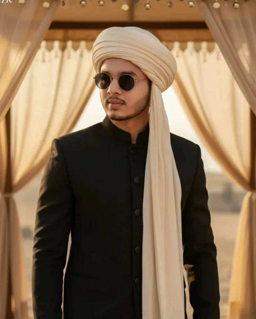 “Create a cinematic desert-style portrait of a man wearing a black tailored sherwani suit with a clean modern fit. On his head, a traditional cream-colored turban with layered fabric wrapping and loose flowing ends draped over the shoulders. Add dark round vintage-style sunglasses with reflective lenses and thin metal frame. He is standing inside a decorated open canopy with hanging fabric and ornaments. Lighting should be warm golden daylight, giving a royal desert leader vibe. Expression confident and powerful. Outfit, headwrap, goggles, and styling must match exactly as reference.