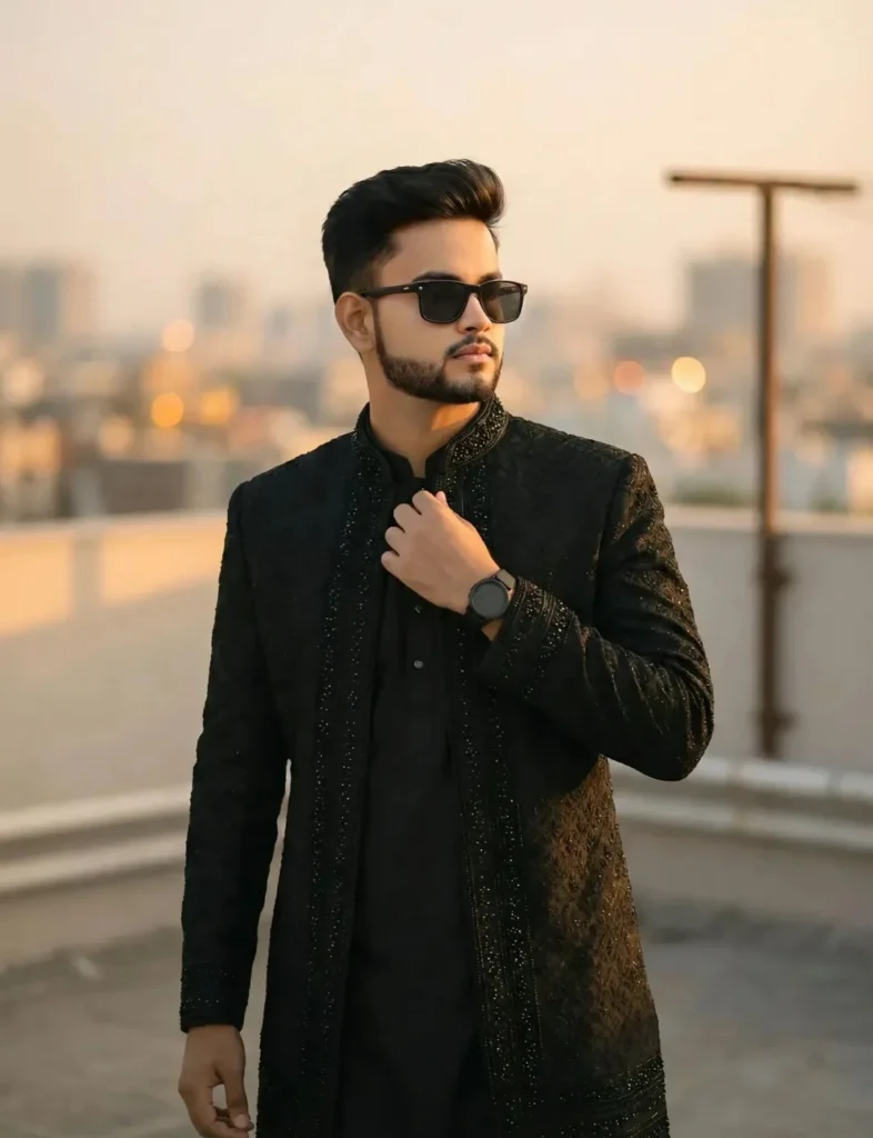 “A stylish young man standing outdoors on a rooftop at sunset, wearing a black embroidered sherwani-style jacket with subtle beadwork and patterns. Underneath, he is wearing a black kurta. He has fair skin, sharp jawline, and neatly styled voluminous black hair with a fade on the sides. He is wearing modern black sunglasses and a black wristwatch. The lighting is soft and warm, giving a cinematic look. Background is blurred with minimal urban elements. The pose is confident with one hand adjusting the jacket. Ultra-realistic, high-detail fashion photography, 8K quality.”