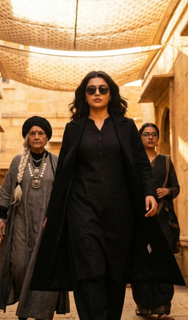 Ultra realistic, cinematic full-body portrait of the same young woman from the reference photo (same hairstyle, defined eyebrows, neatly trimmed facial contours, and confident expression). A powerful cinematic scene showing a stylish female villain making an intense entrance. A sharp-featured woman wearing a black kurta-style outfit, black overcoat, and dark sunglasses walks forward with confidence. Warm golden sunlight filters through patterned fabric shades hanging overhead, creating dramatic light and shadow on her face. Behind her, two women follow one elderly with a long white braided hairstyle, black turban, layered grey robe, and heavy jewelry; the other younger with a confident look, dark glasses, and dark traditional clothing. The environment resembles an ancient marketplace or desert fort made of sandstone, with textured walls and warm golden tones. The camera angle is slightly low, capturing a heroic, slow-motion walk. Highly detailed faces, crisp shadows, cinematic depth of field, rich colour grading, dramatic.”