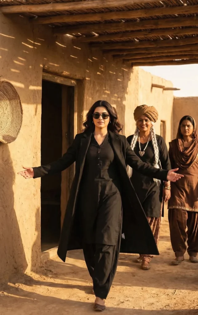 “Ultra realistic, cinematic full-body portrait of the same young woman from the reference photo (same hairstyle, defined eyebrows, neatly shaped features, and confident facial expression). Create a high-quality cinematic scene set in a rustic desert village made of mud-brick walls. The main subject is a stylish woman stepping out confidently from a wooden shaded doorway. She is wearing a full black outfit a long black coat, black kurta-style inner clothing, and dark sunglasses. Her body posture shows attitude and confidence, with both arms extended outward as she walks forward. Behind her, two women dressed in traditional ethnic attire follow her. One woman has a large turban and a white braided style, smiling proudly, while the other wears a brown traditional outfit and stands seriously. The lighting is warm and desert-like, with sunlight filtering through the wooden roof, casting dramatic shadows on the ground and walls. On the left side, a woven circular basket hangs on the mud wall.”