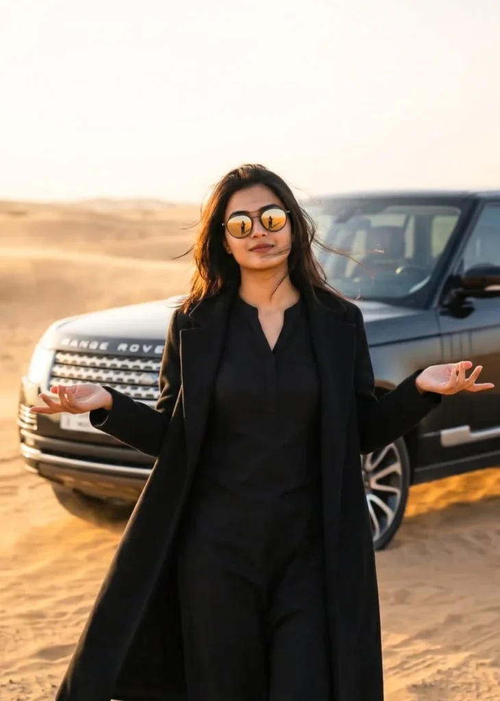 “A stylish woman standing in a desert, wearing an all-black outfit with a black kurta-style dress and a long black coat, hands open in a casual ‘what can I say’ gesture. Wind blowing lightly, desert sand in the background, a luxury SUV behind her. Cinematic lighting, soft warm tones, depth of field, high-quality 4K frame, sunglasses reflecting light, dramatic film look, minimal grain, realistic color grading.”
