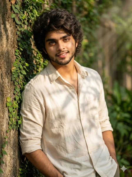 A stylish young man standing beside a soft textured wall partially covered with green ivy plants. Warm sunlight filters through leaves, creating soft light rays and artistic leaf shadow patterns on face, shirt, and wall. Calm outdoor setting with natural greenery and clean aesthetic.
