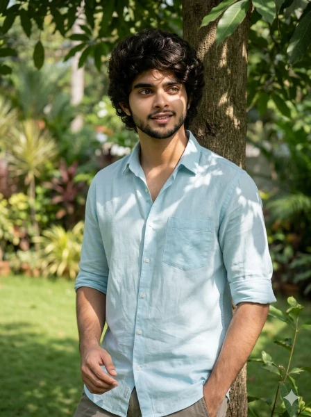 Outfit: light summer shirt (white or pastel), slightly open collar, casual trousers or linen pants, natural fabric folds visible.