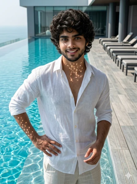A stylish young man standing near the edge of a luxury swimming pool with crystal-clear blue water, modern tiles, and clean architectural lines. Sunlight reflections on water create soft dynamic light patterns around him.