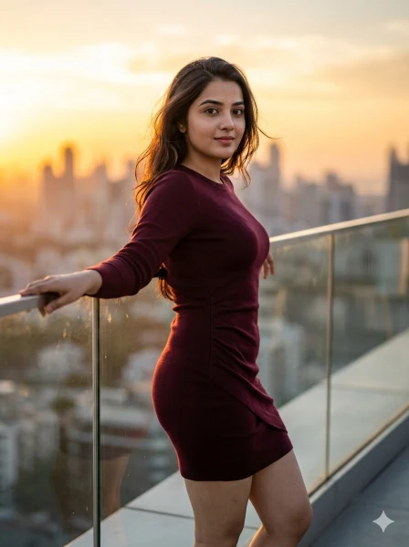 Create an ultra-realistic 8K cinematic fashion portrait of a confident young woman wearing a stylish short dress, standing on a modern rooftop with a glowing city skyline during sunset, capturing a premium fashion editorial mood. Shot on Canon EOS R5 with RF 50mm f/1.8 lens, 3:4 vertical. Face must be ultra-HD, razor sharp, crystal-clear with visible pores, natural skin texture, soft highlights, and remain perfectly in focus as the sharpest element. She is standing near the rooftop edge, slightly leaning on the glass railing with one arm, body angled sideways, one leg relaxed forward in a confident pose. Soft confident expression with a calm slight smile, editorial fashion mood. Modern elegant fitted short dress with smooth realistic fabric texture and natural folds. Hair flowing gently in the wind, skin glowing naturally with warm sunset highlights. Golden hour lighting with soft rim light around hair, cinematic shadows, and warm tones of gold, orange, and beige. Background shows a softly blurred city skyline, buildings, and sky with shallow depth of field. High-end fashion photography, cinematic editorial style, HDR, ultra-realistic, real photo only. Negative prompt: anime, cartoon, fake face, plastic skin, blur, distortion.