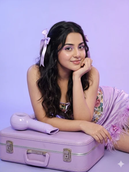 Ultra-realistic portrait, mobile phone quality. Keep face unchanged, no background blur. Model laying on hard-shell suitcase, chin on hand, body stretched out. Floral corset silky lilac mini skirt with orchid feather details. Lilac satin hair bows, pastel purple hair dryer prop. Long wavy hair, soft glam makeup with lilac eyeshadow, glossy lips