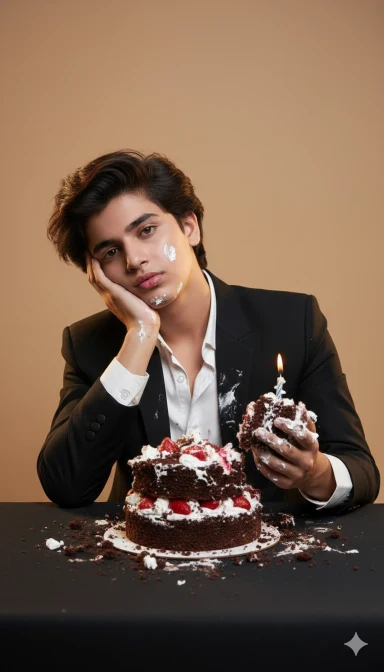 A young man sitting at a table in front of a half-destroyed birthday cake, looking tired and disinterested. He is wearing a stylish black suit jacket over a white dress shirt, slightly unbuttoned. His face and hands are smeared with cake and cream, and he holds a messy handful of cake with a broken candle sticking out. The cake in front of him is smashed, with layers of cream, sponge, and strawberry filling spilling out onto the black table. The background is a plain, warm beige color, giving a minimalist studio look. The lighting is soft and even, highlighting the humorous yet melancholic expression on his face. His posture shows boredom and exhaustion, with one hand resting against his cheek while he stares blankly at the camera. Keep my face same 100%same as in the reference image. Face smile