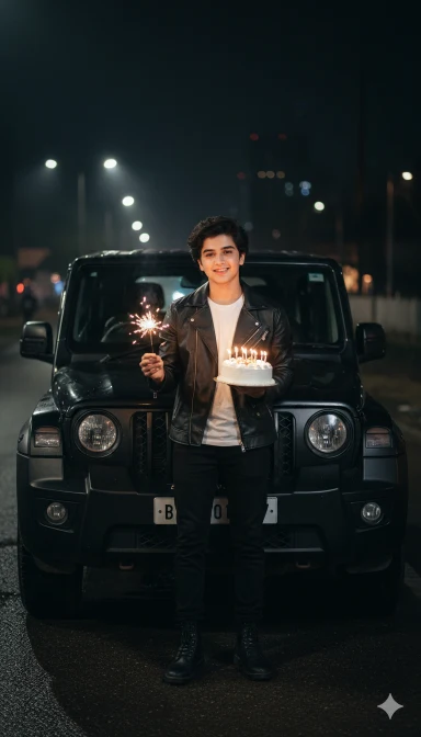 Create a Image and I want 100 percent same face as I uploaded image no alteration, i am man stands in front of a Black THAR at night, holding a lit sparkler in one hand and a small birthday cake with lit candles in the other. He is wearing a black leather jacket, a white t-shirt, and black pants.