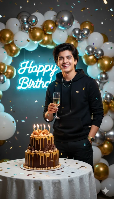 A vibrant birthday celebration photoshoot of a man me standing beside a decorated birthday cake table. He is wearing a casual black Burberry Hoodie, black pants, a golden wristwatch, and a simple chain. He is smiling with joy, holdinga glass in one hand while standing near a two-tier chocolate cake with golden dripping design, decorated with chocolates, popcorns, and candles. The background has white, golden, and silver balloons arranged in a stylish arch with glowing neon ‘Happy Birthday’ sign. Colorful confetti is falling in the air, creating a fun and festive vibe. The man’s face and hairstyle must be an exact match to the reference image provided same beard style, same haircut and same facial details. Lighting should be cinematic, bright, andhigh-fashion style with sharp contrast
