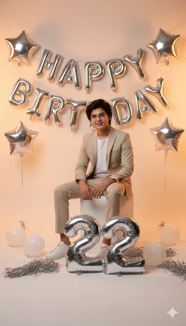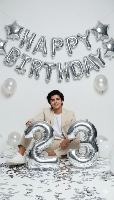 A birthday celebration photoshoot in a stylish modern studio setup. A young man is sitting casually on the floor in front of a decorated wall with silver balloons spelling ‘HAPPY BIRTHDAY and star-shaped balloons. He is wearing a cream/beige suit with a plain white t-shirt inside and white sneakers. In front of him are large metallic silver foil balloons shaped as the number ’23’. The floor is decorated with shiny confetti, balloons, and a soft party vibe. The man’s face and hairstyle must be an exact match to the reference image provided – same beard style, same haircut and same facial details. Lighting should be cinematic, bright, and high-fashion style with sharp contrast Keep my face same 100%same as in the reference image.