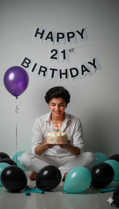 Create a realistic image and i want 100 percent same face as I uploaded image no alteration. I am wearing a white collared shirt, sits on the floor amidst a scattering of balloons (some black, some light blue/teal). They hold a small, round birthday cake topped with colorful sprinkles and a lit candle with the number “21” on it. A purple balloon is tethered nearby, and a “HAPPY 21ST BIRTHDAY” banner hangs on the wall behind them. The lighting is dim, casting shadows from the banner onto the white wall.