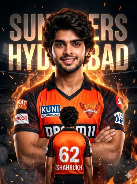 Keep my face 100% same as in the reference image FACE MATCHING INSTRUCTIONS Face must remain exactly same as reference image, no face change, no reshaping, no beautification Create a dramatic ultra-realistic IPL-style sports poster in 8K resolution with extreme sharpness, high contrast, and cinematic lighting. ASPECT RATIO • 3:4 vertical STYLE Professional sports poster design, cinematic IPL theme, high-end graphic composition, ultra-detailed textures. SUBJECT A young male cricket player styled in Sunrisers Hyderabad (SRH) 2025 jersey theme. FACE & LOOK DETAILS Natural skin tone, visible pores, sharp facial features, light beard, confident expression. Face must be ultra-HD and the sharpest element. COMPOSITION • Center: Large chest-up portrait with arms crossed and confident smile • Bottom: Smaller full back-body version wearing jersey showing name and number • Dynamic layered composition OUTFIT DETAILS • SRH-inspired jersey (orange + black gradient) • White sponsor logos on chest and sleeves • Modern 2025 design look • Back jersey text: “62 SHAHRUKH” in bold white POSE DETAILS • Main portrait: arms crossed, chest slightly forward • Back version: standing with back turned, head slightly tilted BACKGROUND • Dark cinematic background • Stadium silhouette behind • Large glowing “SUNRISERS HYDERABAD” text logo • Fire sparks and glowing orange energy effects EFFECTS • Flame and smoke effects around subject • Subtle embers floating • Energy glow behind main portrait LIGHTING • High contrast dramatic lighting • Strong rim light on edges • Face brightly lit with zero blur COLOR GRADING • Orange + black cinematic tones • High saturation sports aesthetic CAMERA & COMPOSITION • Poster-style framing • Face-focused ultra sharp rendering • Depth layering effect MOOD & TONE • Powerful • Aggressive • Energetic • Champion vibe FACE RULES Face must remain ultra-HD sharp No smoothing, no distortion, no AI look NEGATIVE PROMPT face blur, identity change, plastic skin, CGI face, distortion, extra limbs