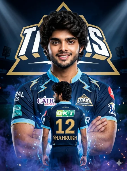 Keep my face 100% same as in the reference image FACE MATCHING INSTRUCTIONS Face must remain exactly same as reference image, no face change, no reshaping, no beautification Create a dramatic ultra-realistic IPL-style poster with 8K resolution, cinematic lighting, extremely sharp face clarity, and high-end sports graphic design. ASPECT RATIO • 3:4 vertical STYLE Professional cricket poster design, high contrast lighting, cinematic sports aesthetic, vibrant and sharp finish. MAIN SUBJECT (FRONT PORTRAIT) • Large chest-up portrait in center • Arms crossed firmly • Slight confident smile • Strong eye contact with camera • Dominant hero stance SECOND SUBJECT (BACK BODY VERSION) • Smaller full-body figure below or behind • Facing away from camera • Wearing Gujarat Titans style jersey • Back text: “12 SHAHRUKH” in bold white • Slight head turn sideways OUTFIT DETAILS • Gujarat Titans inspired jersey (2025 style) • Dark navy + light blue accents • White sponsor logos on chest and sleeves • Premium sports fabric texture FACE & LOOK DETAILS • Ultra-HD sharp face • Visible pores and natural skin texture • No smoothing or artificial glow • Beard and hair details clearly visible BACKGROUND • Dark stadium environment • Gujarat Titans text logo in large golden/white style • Stadium silhouette behind • Subtle spotlight beams EFFECTS • Blue and purple smoke around lower body • Light particles and energy effects • Glow highlights around subject LIGHTING • Dramatic high-contrast lighting • Face perfectly lit and sharp • Strong highlights and shadows COLOR GRADING • Deep blue + gold tones • High contrast cinematic look CAMERA & COMPOSITION • Poster-style composition • Center-focused • Ultra sharp face rendering • Depth layered design MOOD & TONE • Powerful • Confident • Professional • Sports cinematic NEGATIVE PROMPT face blur, identity change, plastic skin, CGI look, distortion, extra limbs,