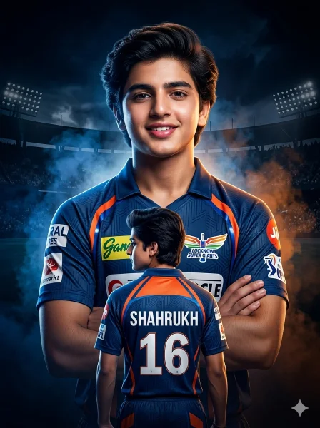Keep my face 100% same as in the reference image FACE MATCHING INSTRUCTIONS Face must remain exactly same as reference image, no face change, no reshaping, no beautification Create a dramatic ultra-realistic IPL-style sports poster using my photo with 8K resolution, hyper-detailed textures, and cinematic lighting. ASPECT RATIO • 3:4 vertical STYLE High-end sports poster design, cinematic cricket theme, sharp, colorful, and premium graphic composition. MAIN SUBJECT (FRONT PORTRAIT) • Large chest-up portrait in center • Arms crossed confidently • Slight forward lean • Strong confident smile SECOND SUBJECT (BACK POSE) • Full-body back-facing version below • Wearing Lucknow Super Giants style jersey • Jersey text: “SHAHRUKH 16” in bold white • Slight head turn (side profile visible) FACE & LOOK DETAILS Ultra-HD sharp face, visible pores, natural skin texture, no smoothing Confident, captain-like expression OUTFIT DETAILS • Lucknow Super Giants inspired jersey (2025 style) • Dark blue + orange accents • Sponsor logos in white on chest and sleeves • Athletic fit BACKGROUND • Dark dramatic stadium silhouette • Abstract cricket stadium lights • Smoke effects (blue + orange tones) • Subtle crowd texture LIGHTING • High contrast cinematic lighting • Strong highlights on face and jersey • Glow rim light from back COLOR GRADING • Deep blue + orange tones • High contrast sports aesthetic CAMERA & COMPOSITION • Poster-style layered composition • Center dominance • Ultra sharp face rendering • Clean depth layering MOOD & TONE • Powerful • Energetic • Heroic • Professional NEGATIVE PROMPT face blur, identity change, plastic skin, CGI look, distortion,