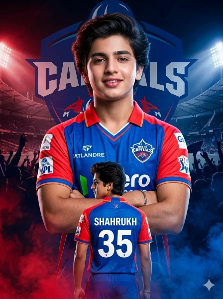 Keep my face 100% same as in the reference image FACE MATCHING INSTRUCTIONS Face must remain exactly same as reference image, no face change, no reshaping, no beautification Create a dramatic ultra-realistic IPL-style cricket poster using my photo, 8K resolution, cinematic lighting, extremely sharp focus, and high-contrast sports design. ASPECT RATIO • 3:4 vertical STYLE Ultra-realistic sports poster design, cinematic IPL aesthetic, bold colors, high contrast, 8K ultra detail. COMPOSITION Create a dual-layer poster composition featuring two versions of the same person. MAIN SUBJECT (FRONT PORTRAIT) • Large chest-up portrait in center • Arms crossed firmly • Confident smile • Direct eye-level angle • Strong hero presence SECOND SUBJECT (BACK BODY) • Smaller full-body version below • Facing away from camera • Wearing Delhi Capitals jersey • Name: “SHAHRUKH” • Number: “35” in bold white OUTFIT DETAILS • Delhi Capitals 2025 style jersey • Blue base with red accents • White sponsor logos on chest and sleeves • Modern athletic fit BACKGROUND • Dark cinematic background • Large Delhi Capitals text logo behind • Stadium silhouette blended into background • Smoke effects (blue + red tone) at bottom LIGHTING • Dramatic stadium lighting • Strong highlights on face and jersey • Deep shadows for contrast • Glow edges around subject COLOR GRADING • High contrast blue + red tones • Vibrant sports color palette • Sharp cinematic finish CAMERA & RENDERING • DSLR 85mm portrait style • Ultra sharp face clarity • No blur on face • High detail textures MOOD & TONE • Powerful • Confident • Energetic • Professional sports vibe FACE RULES Face must be ultra-HD sharp No smoothing, no reshaping, no artificial AI look NEGATIVE PROMPT face blur, identity change, plastic skin, CGI face, distortion, extra limbs,