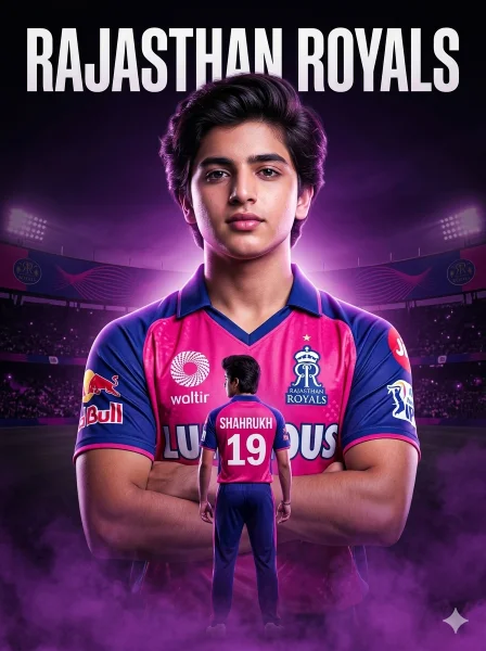 Keep my face 100% same as in the reference image FACE MATCHING INSTRUCTIONS Face must remain exactly same as reference image, no face change, no reshaping, no beautification Create a dramatic ultra-realistic IPL-style poster using my photo with Rajasthan Royals theme, 8K resolution, extremely sharp focus, no blur, hyper-realistic skin texture, and cinematic sports lighting. ASPECT RATIO • 3:4 vertical STYLE Ultra-realistic sports poster design, IPL cinematic aesthetic, high contrast lighting, 8K ultra detail. SUBJECT A confident young male cricketer styled as a Rajasthan Royals player. FACE & LOOK DETAILS Natural skin texture, visible pores, sharp jawline, short beard, ultra-HD face clarity. Face must be the sharpest element in the entire poster. POSE DETAILS • Main portrait: chest-up, arms crossed, strong confident stance • Secondary version: full back-body below • Back pose showing jersey name and number clearly OUTFIT DETAILS • Rajasthan Royals 2025 style jersey (pink + blue accents) • White sponsor logos on chest and sleeves • Back jersey text: “SHAHRUKH 19” in bold white SECOND SUBJECT COMPOSITION • Large front portrait centered • Smaller back pose placed below or slightly behind • Balanced sports poster layout BACKGROUND DETAILS • Dark gradient background (black + purple tones) • Rajasthan Royals styled stadium silhouette • Subtle crowd lighting effect • Smoke/fog in purple tone at bottom LIGHTING DETAILS • Strong cinematic lighting • Face highlighted with sharp contrast • Glow around subject edges • Stadium light reflections COLOR GRADING • Purple + pink team tones • High contrast sports cinematic finish TEXT DESIGN • Large bold title: “RAJASTHAN ROYALS” • Stylish sports typography • Clean placement CAMERA & COMPOSITION • DSLR 85mm portrait look • Center-focused composition • Ultra sharp rendering MOOD & TONE • Powerful • Energetic • Professional • Heroic NEGATIVE PROMPT face blur, identity change, plastic skin, CGI look, distorted jersey, extra limbs,