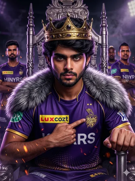 Create a 16K ultra-pro hyper-realistic cinematic digital painting fan edit of the young man from the uploaded image as the supreme “King” figure of the Kolkata Knight Riders (KKR). The scene must have extreme face clarity, high contrast lighting, and a premium poster-style composition. FACE LOCK — ZERO MODIFICATION POLICY Use the uploaded reference image as the exact facial identity source. Face must remain 100% identical. Preserve exact facial structure, beard style, jawline, nose, lips, and natural skin tone. No beautification, no smoothing, no reshaping. FACE CLARITY — EXTREME HD MASTER PRIORITY Face must be razor-sharp, ultra-HD, crystal-clear with visible pores, beard texture, and realistic skin details. No blur, no softness, no artificial glow on face. Face must be the sharpest and most dominant element in the entire poster. ASPECT RATIO • 3:4 vertical STYLE Ultra-realistic cinematic poster, high-end sports fantasy art, 16K ultra detail, dramatic lighting, epic composition. SCENE A royal battlefield-style arena with dark smoky background, glowing embers, and purple-golden lighting creating a powerful KKR theme environment. SUBJECT The man seated on a grand royal throne representing dominance and leadership of KKR. POSE • Sitting on throne with strong posture • One hand gripping armrest • Other hand pointing toward KKR logo on chest • Slight forward lean EXPRESSION • Fierce intense gaze • Dominant king-like expression • Confident attitude OUTFIT • KKR jersey (purple and gold) with sponsor details • Thick grey/silver fur mantle • Royal golden crown with dark jewels DETAILS • Flames and glowing embers in foreground • Metallic textures on crown and throne • Jersey fabric ultra detailed BACKGROUND • Teammates (Shreyas Iyer, Andre Russell, Sunil Narine, Umesh Yadav) • Slightly blurred and desaturated • Positioned behind as supporting figures LIGHTING • High contrast cinematic lighting • Purple + golden highlights • Fire glow reflections COLOR GRADING • Dominant purple + gold palette • Deep shadows + bright highlights CAMERA & COMPOSITION • Cinematic poster framing • Slight low-angle shot • Face-focused ultra sharp rendering • Depth layering MOOD & TONE • Powerful • Royal • Dominant • Epic NEGATIVE PROMPT face blur, identity change, plastic skin, CGI face distortion, low detail, extra limbs,