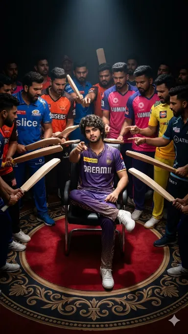 • The Crowd: He is surrounded by a dense crowd of men wearing various other brightly colored franchise cricket jerseys (representing opposing teams, with colors similar to Mumbai Indians, Sunrisers Hyderabad, Rajasthan Royals, Chennai super king, Gujarat Titans etc.).