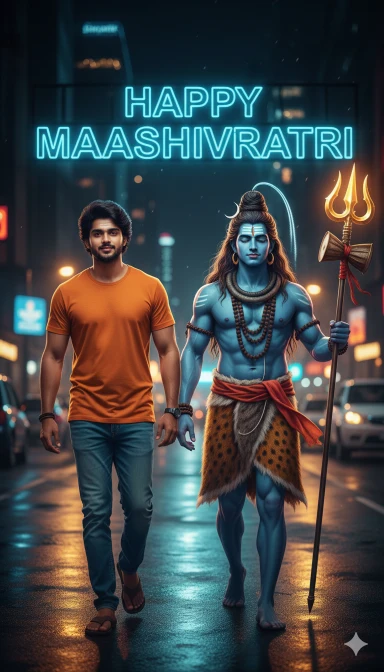 A bright neon sign in the background reading “HAPPY MAHASHIVRATRI”.