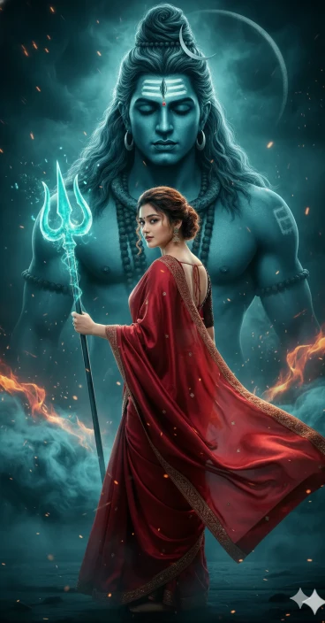 A powerful, cinematic, ultra-realistic spiritual portrait of a woman in a red saree, protected and empowered by Lord Shiva, radiating intense divine feminine energy and strength.