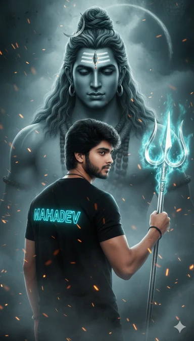 A powerful, cinematic, ultra-realistic spiritual portrait showing a man protected and empowered by Lord Shiva, with intense divine energy.