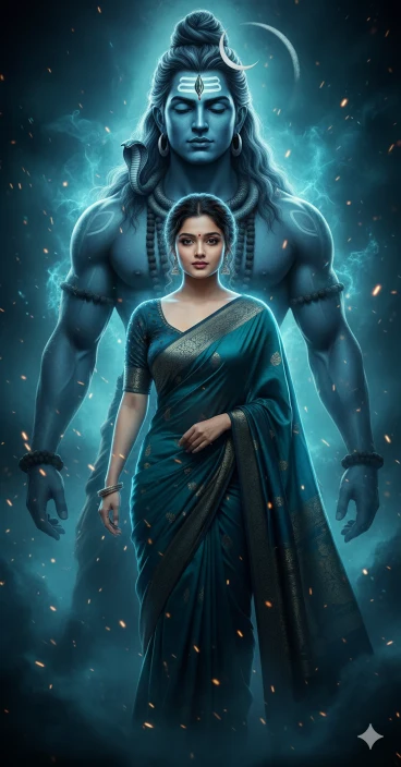 A powerful, ultra-realistic cinematic spiritual portrait of a woman in a background-matching saree, protected and empowered by Lord Shiva, radiating devotion, strength, and divine energy.