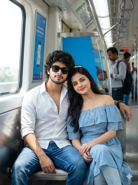 (Keep both faces 100% same as in the reference images) FACE MATCHING INSTRUCTIONS Both faces must remain exactly same as their respective reference images. No face change, no reshaping, no beautification. Maintain exact facial structure, skin tone, eyes, nose, lips, and natural identity for both individuals. ASPECT RATIO • 3:4 vertical STYLE Ultra-realistic cinematic street lifestyle photography, 8K DSLR quality, extremely sharp focus, natural lighting, zero blur, no artificial smoothing, no CGI look, hyper-realistic urban travel photography. SCENE Interior of a modern metro train carriage during daytime. Stainless steel poles, overhead hand grips, long metallic seating rows, blue advertisement panels, and large glass windows allowing bright daylight inside. SUBJECT A stylish young couple sitting together on the metro seat near the window. PERSON DETAILS Young man (early 20s): slim athletic build, wheatish skin tone, light trimmed beard, black sunglasses, modern hairstyle. Young woman (early 20s): slim build, smooth skin tone, long silky hair, natural makeup, elegant appearance. POSE DETAILS • Sitting close together on the metro bench • The girl slightly leaning her head toward the boy’s shoulder • The boy resting one arm casually behind her on the seat • Both bodies slightly angled toward window • Hands relaxed naturally (optional light hand touch) OUTFIT DETAILS • Boy: white shirt (top buttons open), blue denim jeans, white sneakers, black sunglasses • Girl: soft pastel kurti or top with light jeans, minimal jewelry, natural stylish look BACKGROUND DETAILS • Passengers sitting and standing • People holding hand straps • Some commuters chatting in background • Metro posters and signage • Depth with blurred passengers LIGHTING DETAILS • Soft natural daylight entering from windows • Balanced indoor lighting • Natural highlights on both faces • Reflections on metallic surfaces CAMERA & COMPOSITION • DSLR 85mm lens • Eye-level cinematic framing • Couple in sharp foreground, background softly blurred STYLE Hyper-realistic urban couple photography Natural colors, realistic skin texture No blur, no artificial filters EXPRESSION DETAILS Soft romantic expressions with calm smiles, relaxed and natural connection between both. FACE RULES Both faces must remain natural, ultra-HD sharp, no beautification or identity change. NEGATIVE PROMPT blur, motion blur, CGI look, cartoon effect, plastic skin, distorted anatomy, extra fingers, watermark, text artifacts, low resolution.