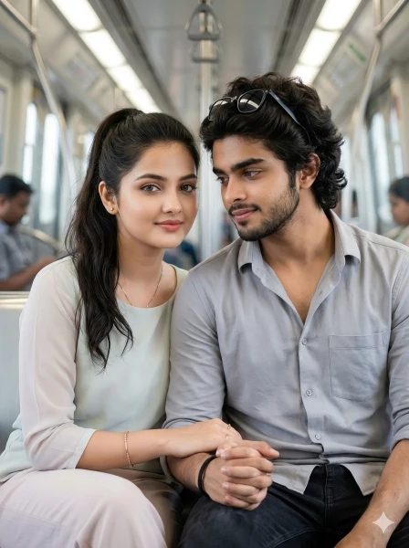 Create an ultra-realistic 8K cinematic close-up portrait of a stylish young Indian couple sitting side-by-side inside a modern metro train during daytime, designed with an intimate emotional vibe and ultra-HD face clarity. FACE LOCK — ZERO MODIFICATION POLICY Use the uploaded reference images as the exact facial identity source (both boy and girl). Faces must remain 100% identical. Preserve exact eyes, nose, lips, cheeks, skin tone, and proportions. No beautification, no smoothing, no reshaping. FACE CLARITY PRIORITY Both faces must be ultra-HD sharp, crystal-clear with visible natural skin texture, pores, and real lighting. No blur, no smoothing. Faces must be the sharpest element in the frame. ASPECT RATIO • 3:4 vertical STYLE Ultra-realistic DSLR photography, cinematic emotional lifestyle + metro romance aesthetic, 8K ultra detail. SCENE Interior of a metro train with metallic seating, window light entering softly, overhead handles, and subtle reflections on steel surfaces creating a calm urban environment. POSE • Sitting very close together • Hands gently holding each other between them • Girl slightly leaning toward the boy • Boy slightly turning toward her • Tight close-up framing from chest to head EXPRESSION Soft emotional expressions with subtle smiles, deep connection and calm romantic energy. OUTFIT • Boy: soft grey shirt + black jeans + sunglasses • Girl: elegant light pastel top + minimal accessories HAIR • Boy: clean modern hairstyle • Girl: smooth silky hair falling naturally LIGHTING • Soft diffused daylight from window • Gentle highlights on skin • Smooth shadow transitions BACKGROUND • Metro interior softly blurred • Passengers barely visible • Minimal distraction, focus on couple CAMERA & COMPOSITION • DSLR 85mm lens • Tight close-up portrait framing • Ultra sharp faces, creamy background blur NEGATIVE PROMPT face blur, identity change, plastic skin, CGI look, over-smoothing, distorted anatomy, extra fingers, low resolution, cartoon effect.
