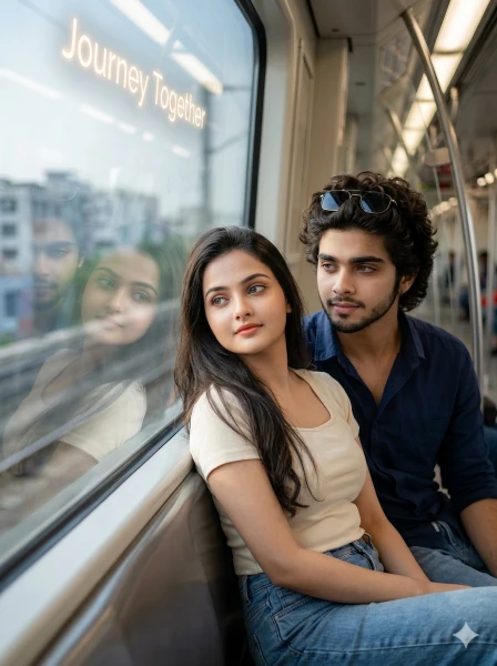 Create an ultra-realistic 8K cinematic portrait of a stylish young Indian couple sitting near a metro window, designed with a reflective emotional travel vibe and ultra-HD face clarity. FACE LOCK — ZERO MODIFICATION POLICY Use the uploaded reference images as the exact facial identity source (both boy and girl). Faces must remain 100% identical. Preserve exact facial structure, skin tone, eyes, nose, lips, and identity. No beautification or alteration. FACE CLARITY PRIORITY Faces must be ultra-HD sharp with natural skin texture, realistic pores, and crisp details. No blur or artificial smoothing. Faces must be the primary focus. ASPECT RATIO • 3:4 vertical STYLE Ultra-realistic DSLR photography, cinematic storytelling + metro travel aesthetic, 8K ultra detail. SCENE Interior of a metro train near a large window, with outside city motion slightly visible through glass, reflections forming on the window surface. POSE • Sitting side-by-side near window • Girl looking outside through window • Boy looking slightly toward her • Their shoulders lightly touching • Reflection of both faces visible on glass EXPRESSION Calm thoughtful expressions with subtle emotional connection and peaceful mood. OUTFIT • Boy: navy blue shirt + denim jeans + sunglasses • Girl: light cream top + denim jeans, minimal jewelry HAIR • Boy: modern textured hairstyle • Girl: long natural flowing hair LIGHTING • Natural daylight entering from window • Soft reflections on glass • Balanced highlights and shadows BACKGROUND • Metro interior with poles and seats • Blurred outside city motion • Glass reflections enhancing cinematic feel TEXT “Journey Together” softly glowing near window reflection. CAMERA & COMPOSITION • DSLR 50mm lens • Side-angle cinematic shot • Faces ultra sharp with reflective composition NEGATIVE PROMPT face blur, identity mismatch, plastic skin, CGI look, distorted hands, extra limbs, low detail, overexposed light, cartoon effect.