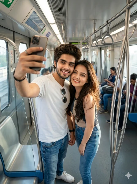 Create an ultra-realistic 8K cinematic portrait of a stylish young Indian couple capturing a selfie inside a modern metro train during daytime, designed with a trendy urban lifestyle vibe and ultra-HD face clarity. FACE LOCK — ZERO MODIFICATION POLICY Use the uploaded reference images as the exact facial identity source (both boy and girl). Faces must remain 100% identical. Preserve exact eyes, nose, lips, cheeks, skin tone, and proportions. No beautification, no smoothing, no reshaping. FACE CLARITY PRIORITY Both faces must be ultra-HD sharp, crystal-clear with visible natural skin texture, pores, and real lighting detail. No blur, no smoothing. Faces must be the sharpest element in the frame. ASPECT RATIO • 3:4 vertical STYLE Ultra-realistic DSLR photography, cinematic trendy lifestyle + metro selfie aesthetic, 8K ultra detail. SCENE Interior of a metro train with reflective surfaces (glass panels, metallic poles), overhead handles, and passengers in the background creating depth and realism. POSE • Boy holding smartphone slightly above eye level (selfie angle) • Girl standing close beside him slightly leaning inward • Both slightly angled toward camera • Subtle shoulder touch • Natural selfie framing EXPRESSION Bright happy expressions with wide smiles, fun and youthful energy. OUTFIT • Boy: white t-shirt + denim jeans + white sneakers + sunglasses • Girl: stylish casual top + jeans + minimal accessories HAIR • Boy: modern textured hairstyle • Girl: soft flowing hair with natural shine LIGHTING • Bright natural daylight from metro windows • Soft reflections on glass and metal • Even lighting across faces BACKGROUND • Passengers blurred behind • Poles and handles creating depth • Reflections enhancing realism CAMERA & COMPOSITION • DSLR 35mm lens (selfie perspective simulation) • Slight high-angle framing • Ultra sharp faces with natural depth NEGATIVE PROMPT face blur, motion blur on face, identity change, plastic skin, CGI look, distorted anatomy, extra limbs, low resolution, cartoon effect.