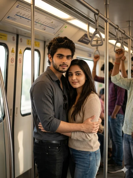 Create an ultra-realistic 8K cinematic portrait of a stylish young Indian couple standing inside a metro train with a protective side-hug pose, designed with a strong emotional cinematic vibe and ultra-HD face clarity. FACE LOCK — ZERO MODIFICATION POLICY Use the uploaded reference images as the exact facial identity source (both boy and girl). Faces must remain 100% identical. Preserve exact facial structure, skin tone, eyes, nose, lips, and identity. No beautification or alteration. FACE CLARITY PRIORITY Faces must be ultra-HD sharp with natural skin texture, visible pores, and crisp details. No blur, no smoothing. Faces must remain the primary focus. ASPECT RATIO • 3:4 vertical STYLE Ultra-realistic DSLR photography, cinematic emotional storytelling + metro lifestyle aesthetic, 8K ultra detail. SCENE Interior of a metro train near the door section with vertical poles, overhead grips, and passengers standing in background with slight blur. POSE • Boy standing slightly behind and beside girl • One arm wrapped gently around her shoulders (side hug) • Girl slightly leaning into him • Both facing slightly toward camera • Balanced standing posture EXPRESSION Soft confident expressions with calm smiles and emotional comfort, showing strong connection. OUTFIT • Boy: dark grey shirt + black jeans + white sneakers + sunglasses • Girl: elegant casual outfit (top + jeans) with minimal jewelry HAIR • Boy: neat textured hairstyle • Girl: silky long open hair LIGHTING • Natural daylight mixed with indoor metro lighting • Soft highlights on faces • Smooth cinematic shadow transitions BACKGROUND • Metro passengers holding straps • Door panels and route maps • Slight depth blur for cinematic feel CAMERA & COMPOSITION • DSLR 50mm lens • Slight cinematic angle • Ultra sharp faces with blurred background NEGATIVE PROMPT face blur, identity mismatch, plastic skin, CGI look, distorted hands, extra fingers, low detail, overexposed lighting, cartoon effect.