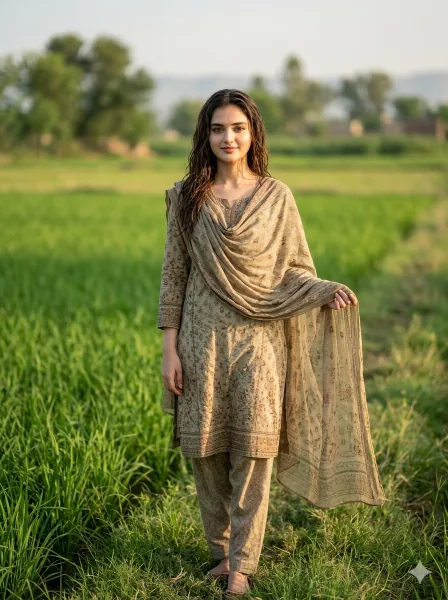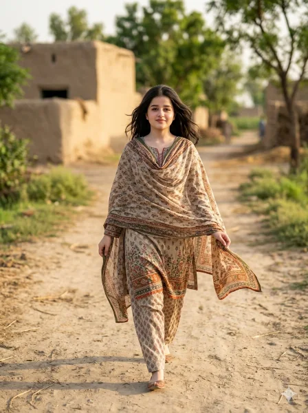 Use the attached reference image as the only face reference with strict identity lock. Keep the face 100% identical — no reshaping, no beautification, no distortion, no AI alteration. Preserve exact facial features, proportions, skin tone, head tilt, camera angle, pores, and natural expression. If face mismatch occurs, reject and regenerate. Create an ultra-realistic 8K cinematic full-body portrait of the same woman walking slowly in a natural Pakistani village setting, captured with authentic rural realism and documentary-style storytelling. Full-body 3:4 vertical eye-level shot, subject centered or slightly off-center, face razor sharp and the most detailed element. She is walking mid-step on a dusty village pathway, one hand lightly holding the edge of her dupatta, relaxed posture, calm natural expression with a soft composed smile. Outfit: printed shalwar kameez with matching dupatta, realistic fabric folds, natural drape, and cultural detailing. Hair open and naturally flowing, skin ultra-realistic with visible pores and soft sunlight highlights. Background includes mud houses, greenery, village trees, and rural pathway softly blurred with depth of field. Warm natural sunlight, golden hour or soft daylight, gentle highlights, natural shadows, HDR, earthy brown-green-beige cinematic color grading. Shot like real cinematic documentary photography with 50mm or 85mm lens, shallow depth of field, premium natural storytelling look. Must look like a real photograph. –ar 3:4 –no anime, cartoon, CGI, plastic skin, over smooth skin, distortion, low resolution